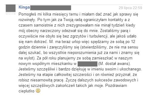You helped me several months ago and I've been supposed to let you know how things went. After having followed your advice by limiting the contact, and later giving it up completely, not even a week had passed when my fiancee contacted me. We became a couple and of course, it didn't go completely smooth, but we have managed to get along somehow. M is on on leave now, so we spend 12 hours a day together, and we have engaged (we decided it's pointless to keep on looking (for better partners), because we've already been through all the misunderstandings and we know each other inside out). After half a year we plan to live together in our new apartment in _____ (M. got promoted). We are happy, and I'd like to thank you on behalf of my fiancee and my own. We're at the stage of a total honesty and he admitted too, that you do an incredible job. I wish you more professional successes and more happy endings, such as mine. Best warm-hearted regards :)