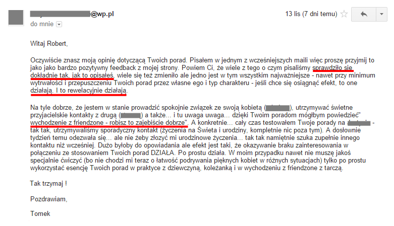 Of course you know my opinion regarding your advices. I have included it in one of my e-mails, so please accept that as a very positive feedback from my side. I'll tell You, that most of the things we had been writing about has proven to be exactly as you described it, many things changed too, but the most important thing about it is – even with a minimal determination and personal reflection on Your advices – if you really want to succeed, then they do the job. A great job. They do so well, that I'm able to maintain the relationship with my woman in peace, be on friendly relations with my ex… and here comes the best … based on Your advices, I'd like to say "leaving the friend zone – you do it f**cking great". And more specifically… I have been testing Your advices all the time with _____ - yes yes, we have been seeing each other rarely (best wishes on Christmas and on Birthday, totally nothing more that). While literally a week ago she contacted me… but not to wish me Happy Birthday … yes yes, she passionately seek a completely different contact than before. That's too much to talk about, but showing a lack of interest in conjunction with your advices WORKS. It just works. In my case, I don't even have to do any specific exercises (because I'm not after easy flirting with beautiful women in different situations), I just need to use the essence of your advices in practice on my girlfriend, my female friend and in leaving friend zone with a shield.